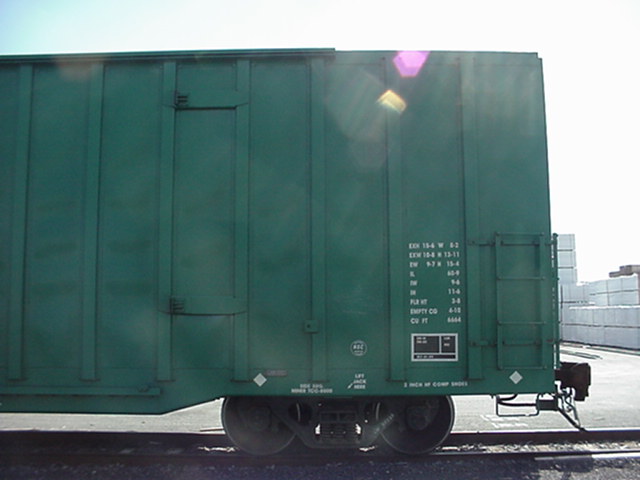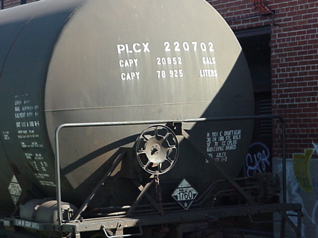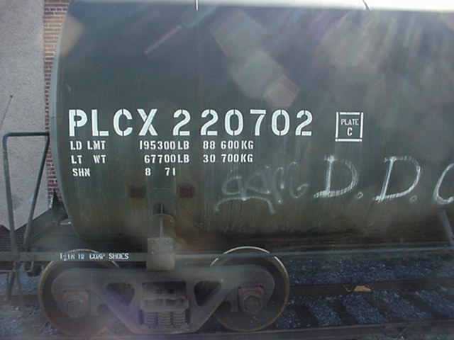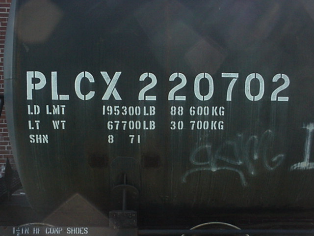"PLCX" correspond aux lettres d'appellation du wagon. Les lettres "PLCX" identifie ce wagon comme appartenant à la compagnie "General Electric Rail service Corp." . Le numéro "220702" est le numéro de série du wagon. Dans une même compagnie, le numéro doit être différent sur chaque wagon. Souvent, les compagnies numérotent leur wagon en suivant un ordre de série. "LD LMT" signifie "load limit" (limite de charge). Cette mesure, exprimé en livres (lbs) et en kilo sur ce wagon, correspond au total du poids de la marchandise que peut contenir ce wagon. "LT WT" signifie "light weight" (poids à vide). C'est le poids, en livres et en kilo, du wagon lorsqu'il est vide. "PLCX" are the reporting marks of the car. According to the AAR Reporting marks list, this car belong to General Electric Rail Service Corp. The number "220702" is the serial number of the car. In a company, every car must get a different number. Often, the compagnies numbered their car in series. LD LMT means load limit. It's the maximum weight in pounds and kilo, on this car, acceptable for the load of this car. LT WT means light weight. It's the weight of the car when empty. |
