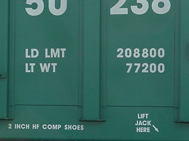 "LD LMT" signifie "load limit" (limite de charge). Cette mesure, exprimé en livres (lbs) correspond au total du poids de la marchandise que peut contenir ce wagon. "LT WT" signifie "light weight" (poids à vide). C'est le poids, en livres, du wagon lorsqu'il est vide. LD LMT means load limit. It's the maximum weight in pounds acceptable for the load of this car. LT WT means light weight. It's the weight of the car when empty. |