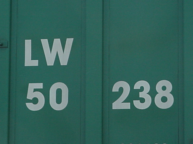 "LW" correspond aux lettres d'appellation du wagon. Les lettres "LW" identifie ce wagon comme appartenant à la compagnie "Louisville and Wadley Railway Company". Le numéro "50238" est le numéro de série du wagon. Dans une même compagnie, le numéro doit être différent sur chaque wagon. Souvent, les compagnies numérotent leur wagon en suivant un ordre de série. Dans ce cas-ci, tous les wagons de ce type de la compagnie L&W Rwy sont numérotés dans la série 50 200. "LW" are the reporting marks of the car. According to the AAR Reporting marks list, this car belong to Louisville and Wadley Railway Co. The number "50238" is the serial number of the car. In a company, every car must get a different number. Often, the compagnies numbered their car in series. In this case, every car of this type in the L&W Rwy Co. are numbered in the 50 200 serie. |