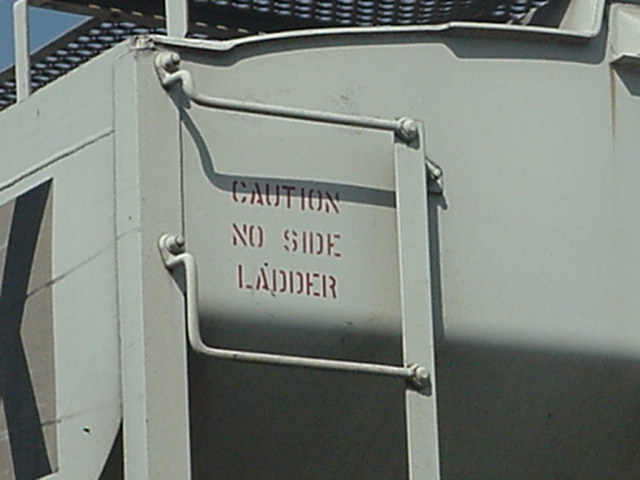 Une indication disant qu'il n'y pas d'échelle sur le côté. Normalement, il y en a une. (photo prise sur un autre wagon) A sign to caution the user that there is no ladding on the side of the car. Normally, there is one. (Picture took on an other car) |