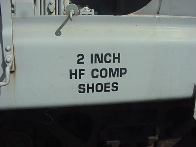 Au bas du wagon, on peut lire "2 inch HF Comp Shoe". C'est le type de sabot de frein utilisé. "2 inch" signifie que les semelles de frein ont 2 pouces de largeur. "HF Comp" signifie Composition, le nom du matériel utilisé pour la confection de la semelle. Une autre sorte peut être Sindered Iron (SP). At the bottom of the car, we can read "2 inch HF comp shoe". This refer to the brake pad used on the car. 2 inch means that the brake pads are 2 inches wide. "HF Comp" is the name of the material used in the pad. In this case, Composition material. It can also be Sindered Iron (SP). |