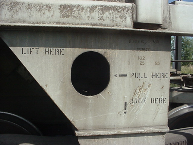 À droite du trou, on voit "Lift Jack Here". En cas de déraillement ou de maintenance, c'est là qu'il faut insérer le crochet de la grue qui lèvera le wagon. (photo prise sur un autre wagon) At the right of the hole, we read "Lift Jack Here". In case of deraillement or maintenance, the hook of the crane must insert in this hole. (Picture took on an other car) |