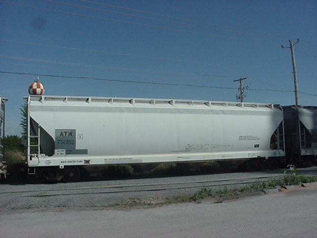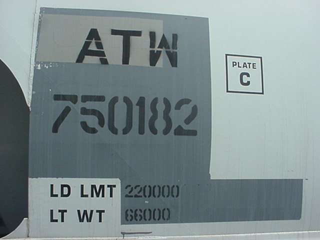 "ATW" correspond aux lettres d'appellation du wagon. Les lettres "ATW" identifie ce wagon comme appartenant à la compagnie "Atlantic and Western Railway". Le numéro "750182" est le numéro de série du wagon. Dans une même compagnie, le numéro doit être différent sur chaque wagon. Souvent, les compagnies numérotent leur wagon en suivant un ordre de série. "Plate C". La plate correspond au diagrammes représentant les mesures extérieures maximums de wagon. Ce wagon est donc compatible avec toutes les lignes ayant un dégagement suffisant pour les "plates C" ou plus. "LD LMT" signifie "load limit" (limite de charge). Cette mesure, exprimé en livres (lbs) correspond au total du poids de la marchandise que peut contenir ce wagon. "LT WT" signifie "light weight" (poids à vide). C'est le poids, en livres, du wagon lorsqu'il est vide. "ATW" are the reporting marks of the car. According to the AAR Reporting marks list, this car belong to Atlantic and Western Railway. The number "750182" is the serial number of the car. In a company, every car must get a different number. Often, the compagnies numbered their car in series. "Plate C". The plate match the diagrams of exteriors dimension for this car. This car is compatible whit every line that accept plate C clearance or more. LD LMT means load limit. It's the maximum weight in pounds acceptable for the load of this car. LT WT means light weight. It's the weight of the car when empty. |