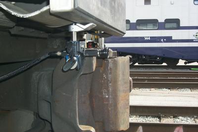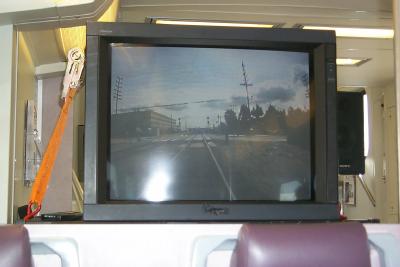 The small CCD camera sends an "engineer's view" to the television monitors in the coaches of the special train where the truckers and news media could watch cars passing over the grade crossings ahead of the train. |