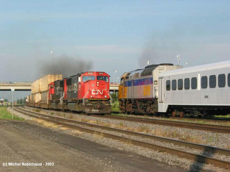 CN's intermodal train 121 (Halifax - Toronto) lead by SD70I 5618 is meeting a suburban train bound for McMasterville at St-Lambert, QC, on August 2nd, 2002. |