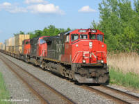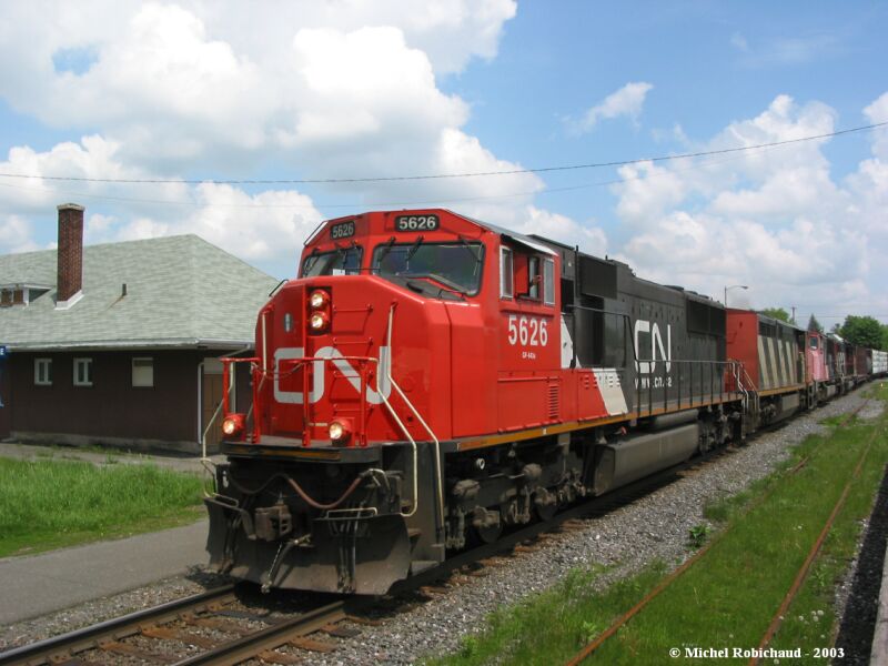 CN 368 is waiting on a siding at Rivière-des-Prairies, MP 132.8 CN St-Laurent Sub, before heading to northern Quebec on a warm June 23rd 2003.