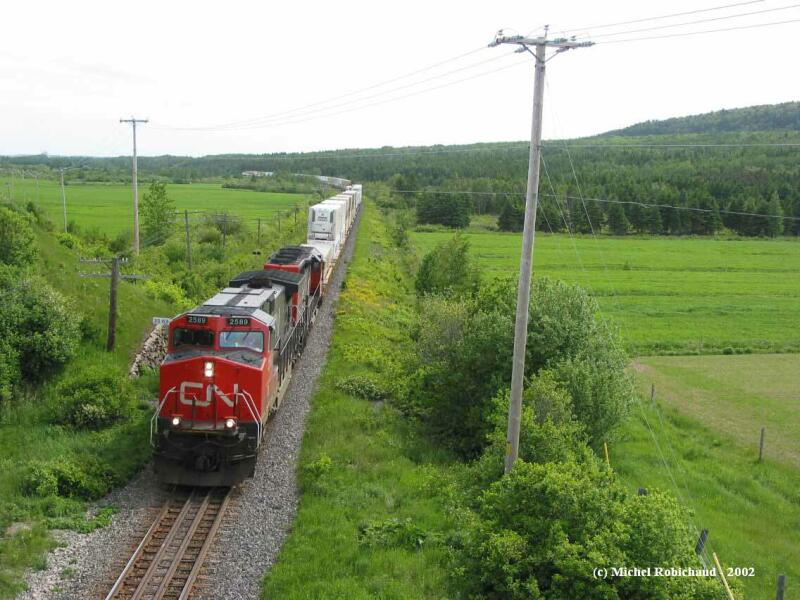 CN train 121 (Halifax, NS to Toronto, ON) is lead by Dash 9-44CW number 2589 at St-Philippe-de-Néri, QC (MP 33.6, Montmagny Sub), on June 15, 2002. |