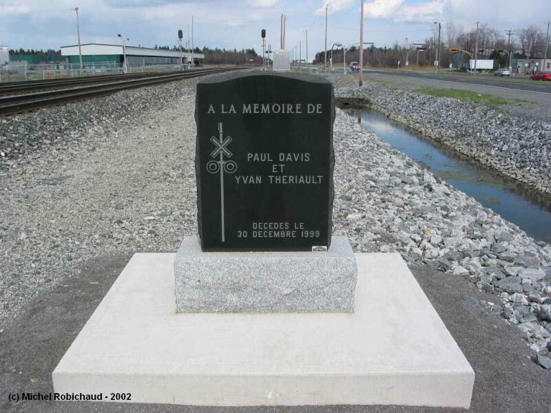 This stone was erected at the accident site in loving memory of Paul Davis and Yvan Thériault. Picture taken on April 7th, 2002. |