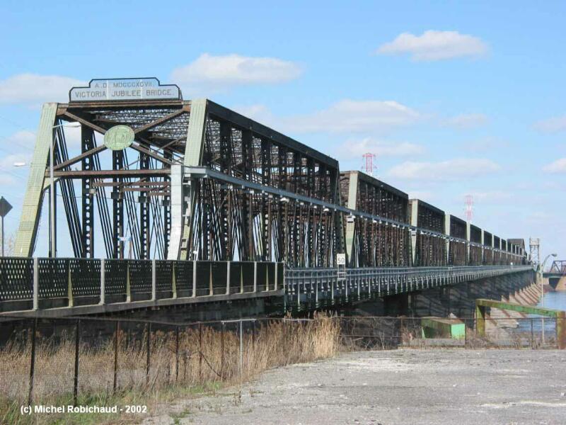 The Victoria Bridge was opened in 1858, and rebuild in 1899 to it's actual aspect. It links Montreal, QC to St-Lambert, QC over the St-Lawrence River. Picture taken on April 21st, 2002. |