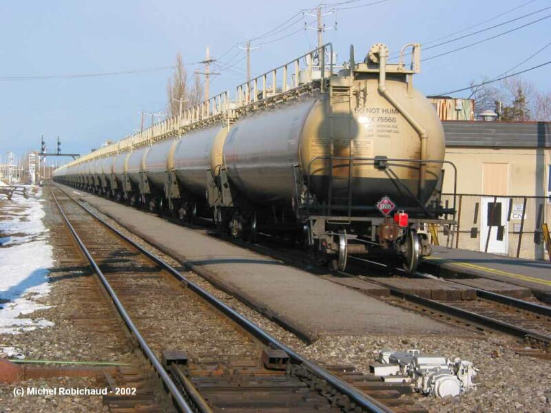 CN's eastbound unit train no. 782, the Ultratrain is seen at St-Lambert, QC, on March 30th, 2002. The 4 - 17 cars sets will reach their final destination, St-Romuald's refinery, a few hours later. |