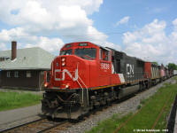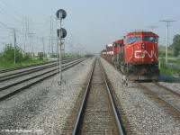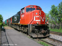 CN train 121 (Halifax, NS to Toronto, ON) at St-Hilaire, QC (MP 52.2, St-Hyacinthe Sub), on June 8, 2003. |