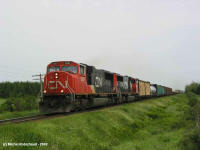 After taking over CFMG's train 403 in Rivière-du-Loup, CN' train 403 is continuing westward, en route to Joffre, just opposite of Quebec City. MP 50.9, Montmagny Sub, June 30th, 2002. |