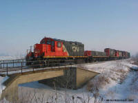 GP9RM 7275 is leading this westbound freight at Bruno Jct, on a bitterly cold morning. March 1st, 2003. |