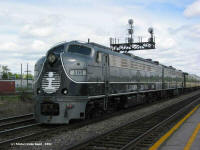 Illinois Central's E9AR number 102 and 103, painted in green/black/yellow CN's passenger livery of the '50s, are moving private dome car California Zephyr toward Montreal's Central Station for a special activity to be held on the following day.