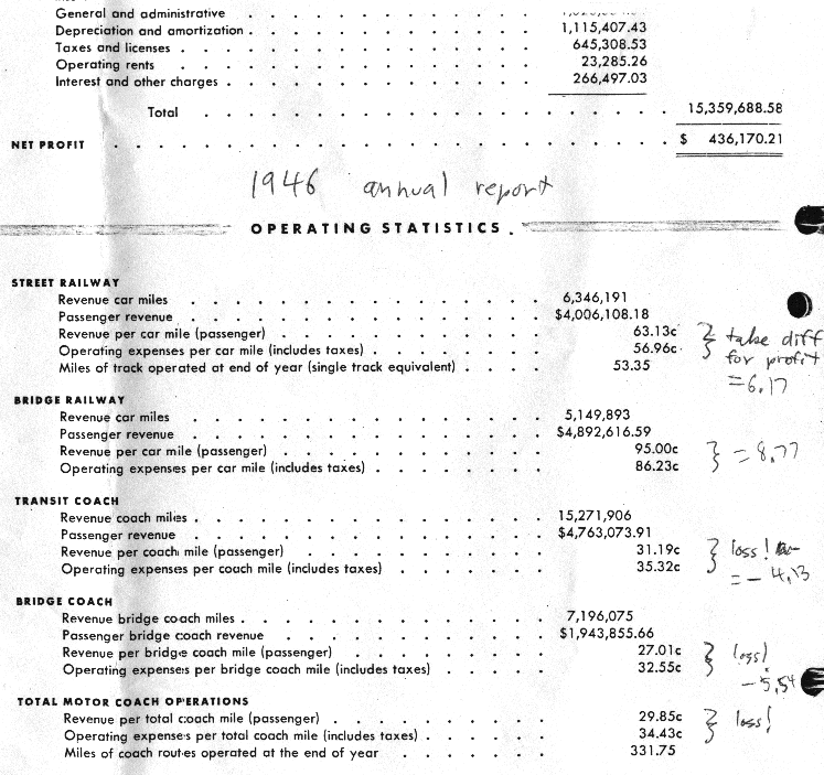 Figures show that streetcar and electric trains were profitable, while buses lost money. Overall, there was a profit even after paying a huge tax (equivalent to over $6 million in today's money, annually). The penciled calculations are the author's (who now wishes he made a photocopy of the entire page).