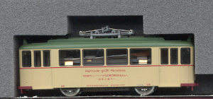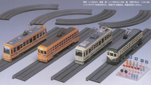 Kit with four static undecorated street car models (two each of Tokyo Toden 6000 and Toden 7000) and an oval of streetcar track in brick paved street, all in unpainted grey plastic. The trucks are plastic with plastic wheels, but they are really only suitable as static models. The track is N-scale (9 mm). Later reissued as item 2154. |
