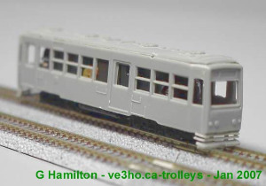 This is the economy kit version for a Keihan 500 type 2-car set. It comes unpainted and requires a GM-593 power chassis and pantographs to complete it. The model is shown here powered and decorated.