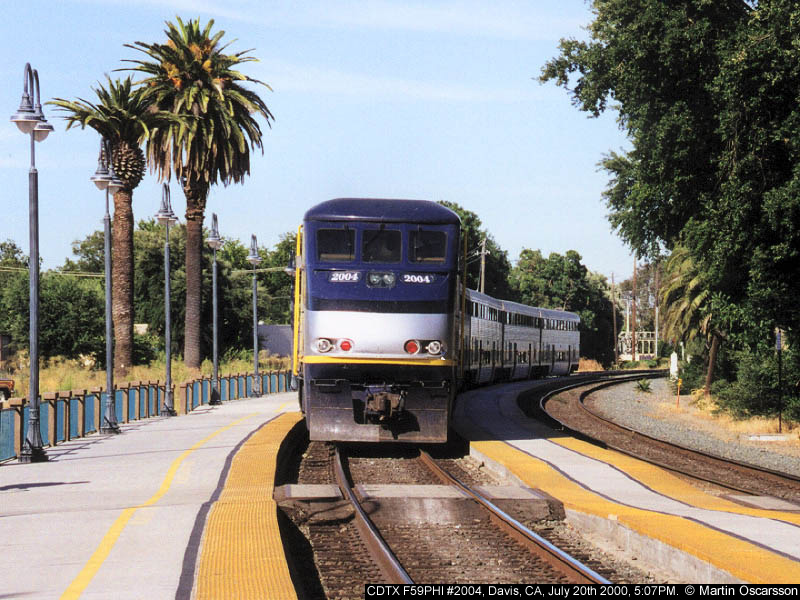 CDTX F59PHI #2004 departing Davis, CA, with Capitol train 728 bound for