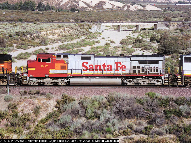ATSF C44-9W #662 at Mormon Rocks on Cajon Pass, CA, July 27th 2000. |