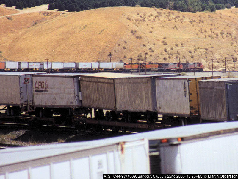 Santa Fe C44-9W #669 at Sandcut, CA, with an eastbound intermodal train,