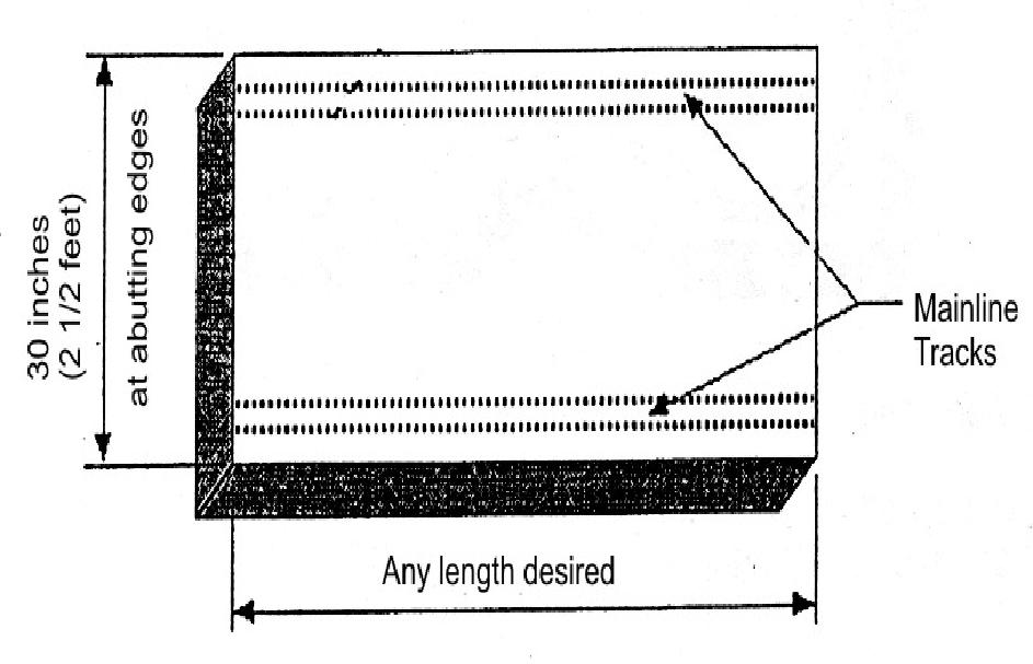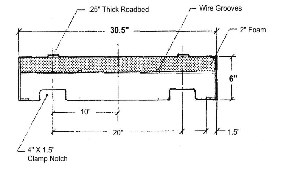 The Bend Track modular system is based on standard modules of varying lengths that are 30 inches in width at their abutting surfaces. The entire concept is based on a two sided module with a single mainline on both sides. (It should be noted here that the original Bend Track concept is in N scale and utilizes double east bound and west bound mains).