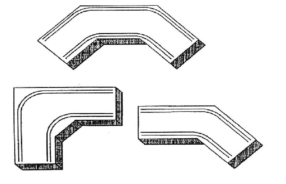 Curved modules can be built with any amount of curvature that is desired or needed to fit a particular space or area. Traditional modular systems rely heavily on having four 90º corner modules in order to have a complete running layout. With Bend Track the need for corner modules does not exist. A 90º curved module is possible, but not absolutely required. Curved modules may be designed to any desired amount of curvature or angle. The thing to remember about a curved Bend Track module is that the curve of the module is not itself necessary to make the system work. The reason to curve a Bend Track module is to create a more natural or pleasing appearance to the eye or to better match what you want the track to be doing, such as an offset or "S" shaped module where the track follows a river or hillside.