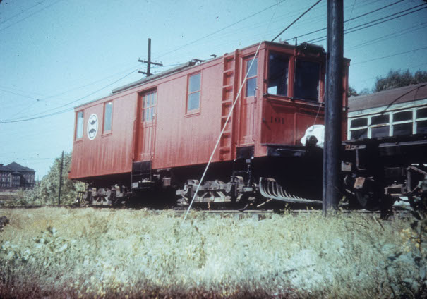 Another SHRT Work Car! - Line car OX isn't Michigan's only gift to the Shaker Rapid. In 1932 the Cleveland Interurban Railroad (Shaker Rapid) bought an Eastern Michigan Railway line car. Re-numbered 101, the car was used to maintain the Shaker Rapid's overhead under the Van Sweringen (CIRR) and municipal (SHRT) owners until 1966. At that point the Ohio Railway Museum in Worthington narrowly out-bid NORM for the car, and it went south. This December NORM bought the car from ORM, and the familar car moving ritual will begin again. 101 is in good overall and fair cosmetic shape, marred only by a possible burnt-out traction motor. We might even be able to use it for next summer's overhead work.