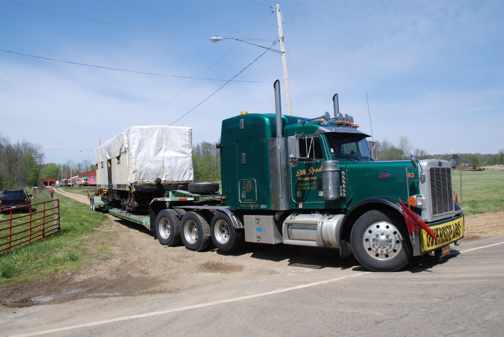 101 Arrives! - After years in the suburbs of Columbus, Shaker Heights Rapid Transit line car 101 is back with its running mates. Preparation began on April 19th as members widened and smoothed the driveway apron to welcome big, heavy trucks. Simultaniously a nearby culvert was extended to facilitate backing moves. Two days later members travelled to the Ohio Railway Museum at Worthington to prep 101 for movement. Shortly after 3:00 PM on Apr. 24th the car arrived on a beautiful green Silk Road rig.