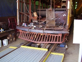TTC 2778 - Side sheet replacement nears completion, and electrical conduit installation is done. The rear truck has been totally dismantled. Most parts have been cleaned, primed and finish painted in light grey. The motors are being test run on low-power current, and show every sign of being servicable.
