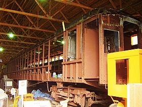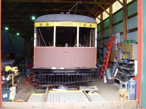 Work begins on SHRT 303 - In 1928, while operating on the Aurora, Fox River & Elgin, this car collided with a circus elephant. But that damage was repaired long ago. The caved-in end with which it arrived at NORM was damaged at Trolleyville USA and never repaired. This October, Museum volunteers began work on the crushed dasher. After clearing out the dented metal and broken wood, metal structural plates were fabricated at NORM and an outside shop. The controller and brake stand are bent back, and will need to be re-plumbed before the end can be closed. The smoker end is okay, you can see it in the photos in the Car 303 page of our Collection pages.