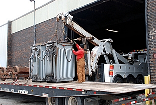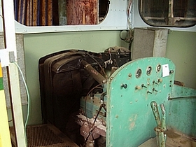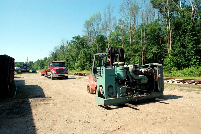 We have a generator!- Electrification took a big step forward when a 150 kW generator arrived at NORM. For years the power plant stood watch at WJW-TV's Parma OH transmitter, providing standby power for broadcasts. Over time, conversion to digital equipment overwhelmed its capacity, rendering the unit obsolete. The station donated the unit to our cause, and the time homered ritual of flatbed trucks, forklifts and riggers began anew. The 3-phase generator is powered by a General Motors 6-110 diesel engine- big brother to the engine in our Plymouth. For now the unit resides in the Plunkert garage.