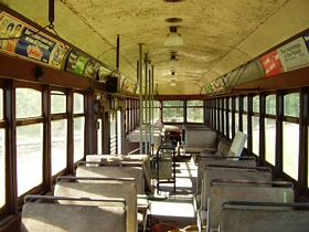CIRR 1225 - Cleveland Interurban 1225 (SHRT 25) easily passes the “ 50/50 ” test (looks perfect from 50 feet or 50 MPH). But its inside is battered from years of service. Interior rehab began when leather-covered cushions on the front seats were replaced with rattan wicker cushions. Missing grab bars and their brass mounts were replaced with parts recycled from the leather seats. Damaged rear seats remain to be fixed. Weather permitting, stained upholstery and seat supports will be washed, and the wicker will get protective coats of varnish. Finally, brass and wood seat back fittings will be polished to complete the overhaul. The interior is being vacuumed as work progresses, removing ages of dirt.