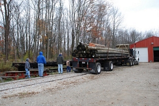 The poles are here! - No, not Chopin and Paderewski, but overhead utility poles. The week of Halloween 2010 saw 20 pine poles arrive by truck. Using our sturdy Gehl loader, members transferred the load to our Illinois Central flat car. When installed, the poles will support our Trolleyville bracket arms and then the trolley wire will be attached using our St. Charles Line hardware.