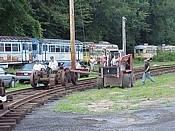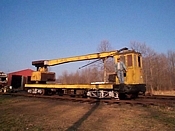 Our track mobile and four wheel crane car are ready for service. The flat car between them is used for building the railroad as well as