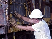 one shows the PRR boxcar being sandblasted and primed (the interior is