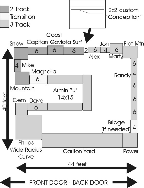 Members are encouraged to build sectional parts of a layout, known as modules, according to the club standards. These are straight sections, usually between 4 and 8 feet. In addition to the member owned modules, the club owns four corner modules and a new 32-foot yard area. At train shows, meets, and other events, we assemble these modules into a single layout ( Example ).