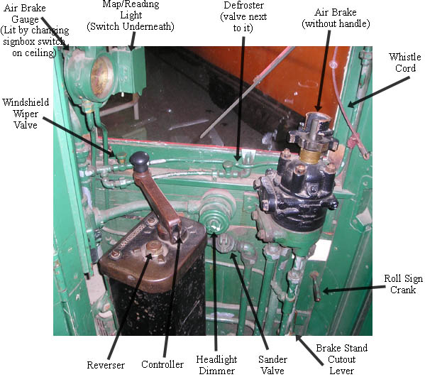 Above: Ceiling of cab, Cab heater switch on left, controller breaker and reset on right.