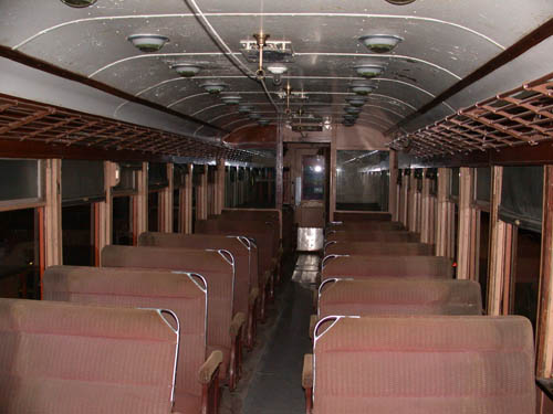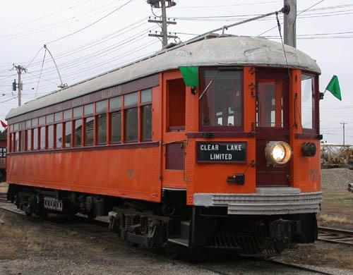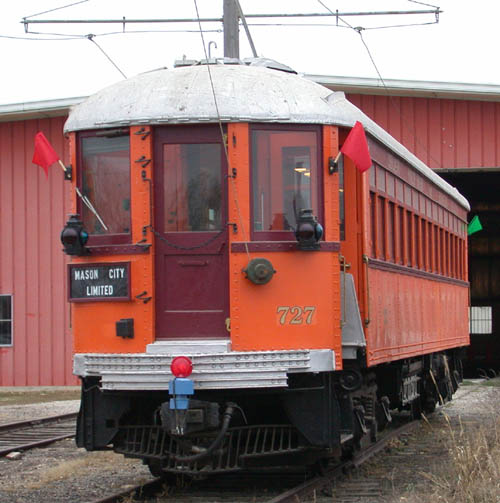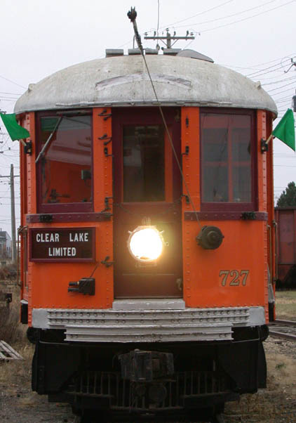 Car 727 is a standard coach that was modernized in 1940 with the lower ceilings, fish-eye lights, and new seats. Car 727 is owned by the Iowa Traction Railroad, and does occasionally operate. The car has been painted in the traction orange scheme, which is the first scheme the North Shore used on these cars. Destination signs are places on the Iowa Traction.