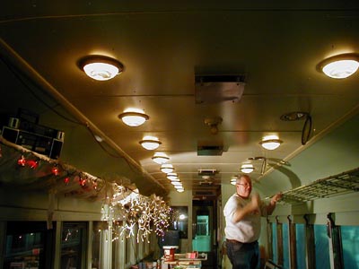 Above: Gwyn Mibeck touches up paint on the baggage racks in the main coach section.