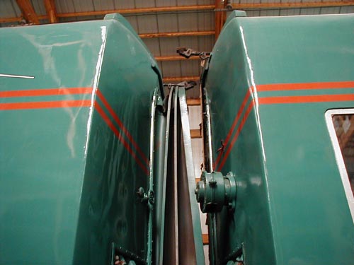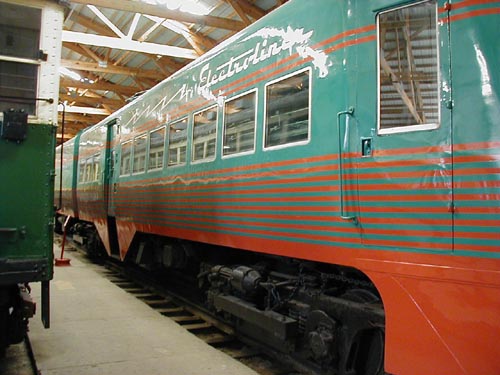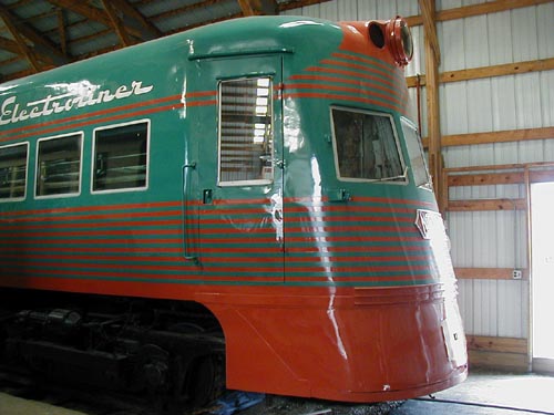 The electroliners were the last attempt to modernize the North Shore fleet. As opposed to the silverliner solution on standard cars, these were a genuine advancement in interurban technology. The streamlined, articulated trainsets were state of the art and had features not on standard cars such as air conditioning and a tavern lounge with a kitchen. The tavern lounge on these trains led to the famous "Electroburger," a hamburger you could have while on the train. These cars were capable of speeds up to 110 mph, the only drawback being they could not train with other cars. They could only operate as sets. The trains were sold to Red Arrow, a commuter system near Philadelphia at abandonment. That line operated the cars, but found quirks such as the fact that they drew too much current on their line. This electroliner is numbered 801-802, and is one of two electroliner sets the railroad owned. It has been fully restored to the original paint scheme, but is not operational. Several traction motors must be replaced before it is operational, and this is very expensive to do. However, given the prominence of this train, it is likely that it will once again streak down the mainline, although not at its former speeds.