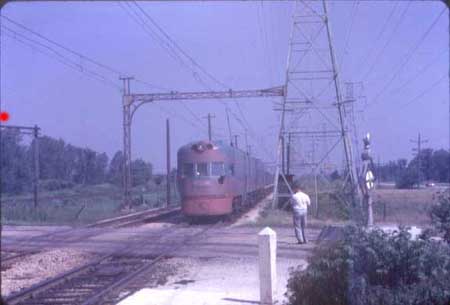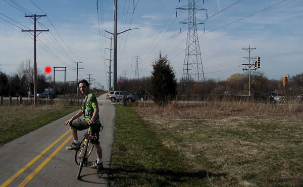 The red dot indicates the pole on the former CNW that appears in both photos. This shot is facing north towards Old Elm (incidently, that is not me in the photo).