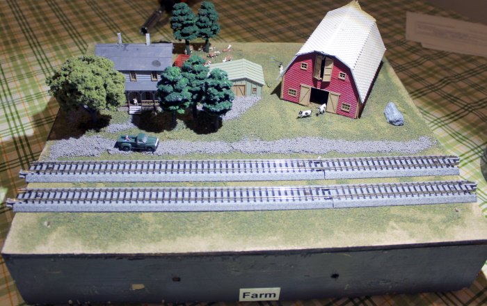 Farm I built the "Farm" module as the lead-in component of the Farm/Tower/Gravel quad. It represents a dairy farm one would typically see in the flatlands of the upper Mid-West. The farmhouse has a small garden behind it, with a tractor and hay wagon. The cows can be seen leaving the barn after milking.