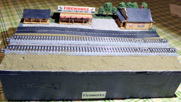 Back in 2014, Fireworks was the first T-TRAK module I built. It depicts what you typically see as you travel down a 2-lane country road in the South. There's a general store, house, and of course, a store selling Fireworks. Hopefully, customers will remember to extinguish their cigarettes before entering the store. | |||