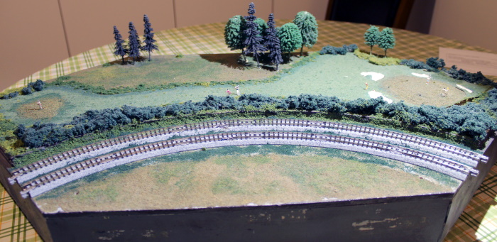 Several years back when our train club members started to build T-TRAK modules in earnest it became obvious that we needed inside corner modules, and the idea for a golf scene took shape. After scanning dozens of golf magazines for ideas, I finally settled on one of the holes at Pebble Beach. Although I took some liberties with the number of players on the course (too many), the result finally took shape. And what better name for this corner module! | |||
