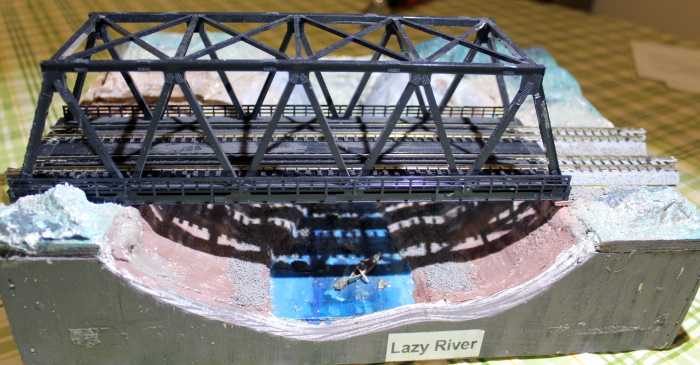 I have seen dozens of Southern themed movies featuring a railroad trestle over a river with kids fishing. They inspired me to do my version with a bridge and the addition of a waterfall and folks furiously paddling a canoe away from the rapids. | |||