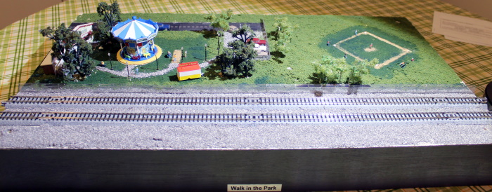 This module represents a summer day in the park. It has sports facilities and features a working carousel. If you look closely you can see a game of horseshoes in progress, and a baseball game with a runner rounding first. Food stalls are available if you get hungry! Like my "H Line" module, this was one of the last kits produced by the late Terry Nathan. | |||