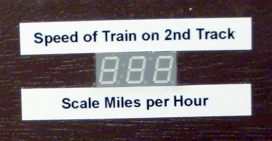 The photograph of the bottom shows the readout mounted in the module's fascia, and connected by multiple wires to the TrainSpeed circuit board. The multi-wire cable connects the circuit board to the two optical sensors mounted in the track base. The TrainSpeed circuit board is powered from the 15VAC Accessory Bus via a protecting fuse and a diode bridge, shown in the right half of the photo. | |||