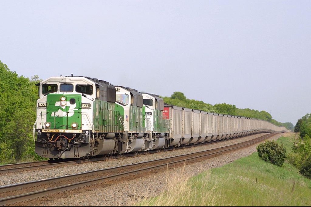 A rare 3 three-unit set of Burlington Northern SD60M locomotives lead an eastbound loaded coal train