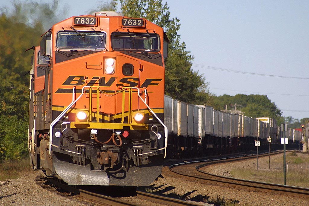 A fairly new BNSF ES44DC leads a long intermodal through the curve in downtown Elk River, Minnesota.