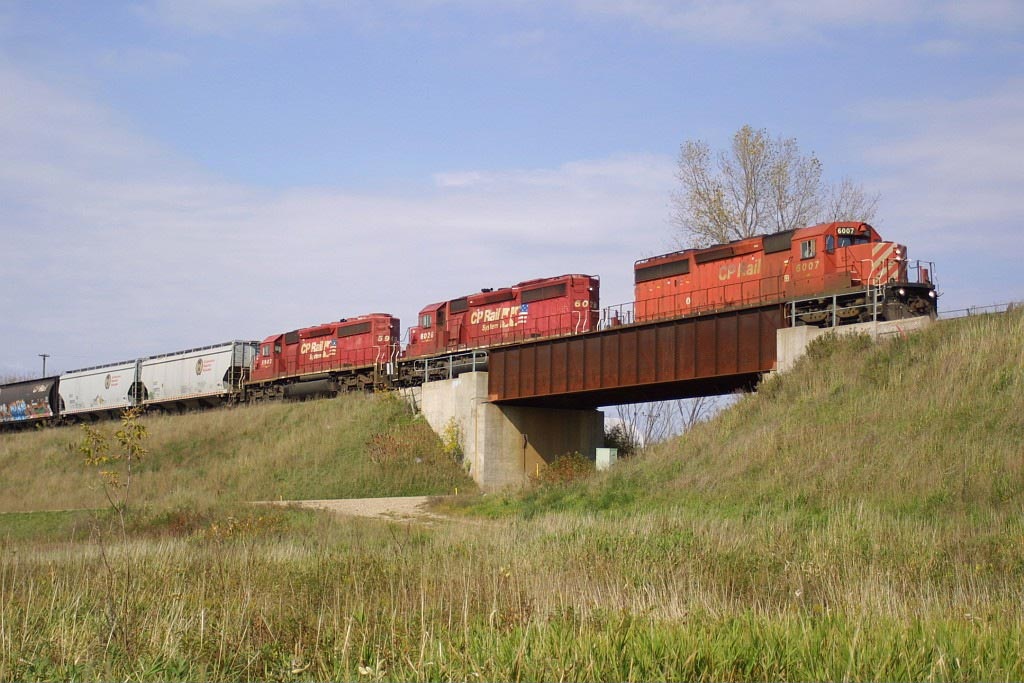 Three faded red SD40-2's lead a long CP grain over over a fairly new bridge over Colton Avenue NW just north